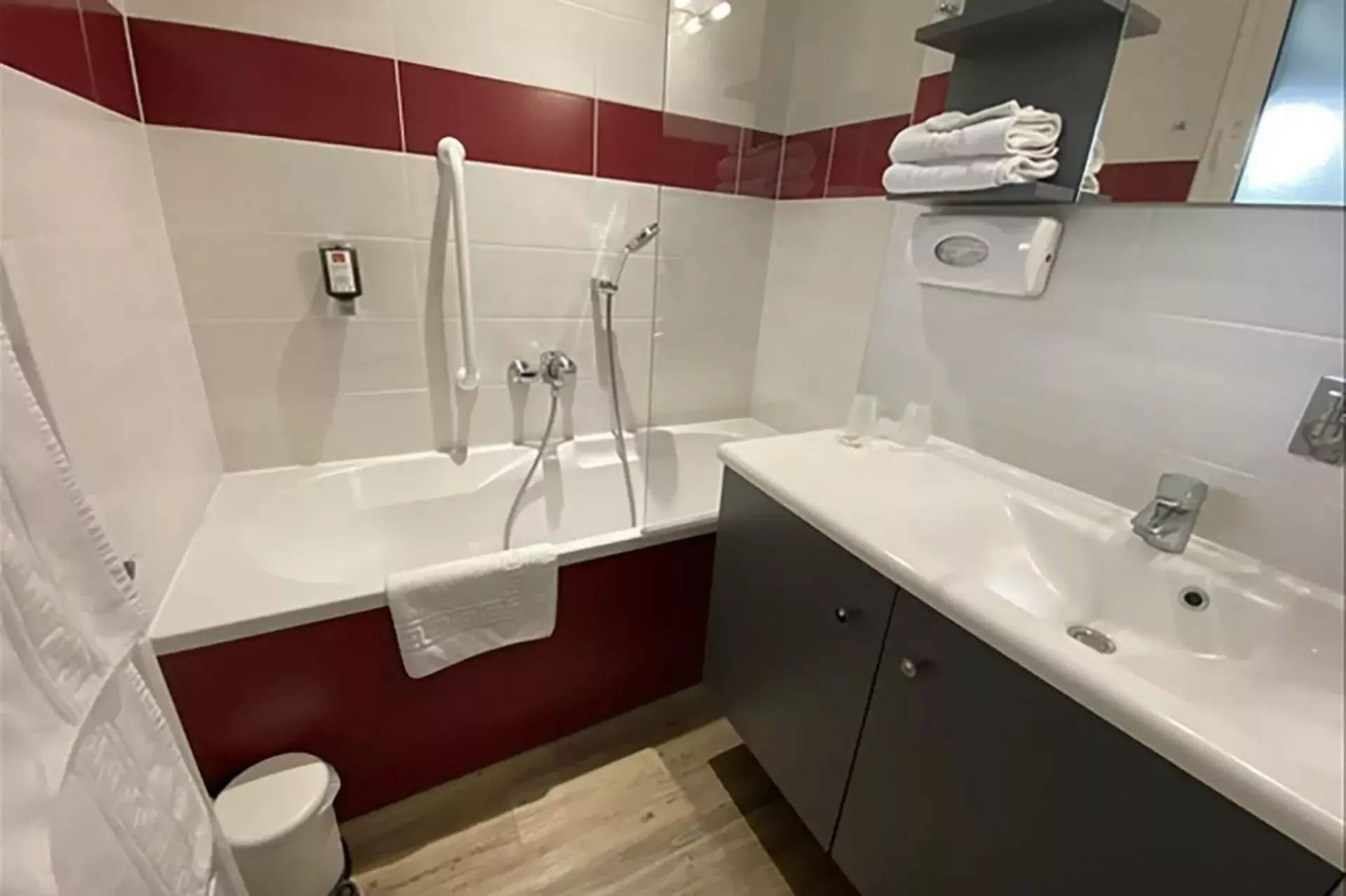 Bath, washbasin, hair dryer, storage. Separate toilet